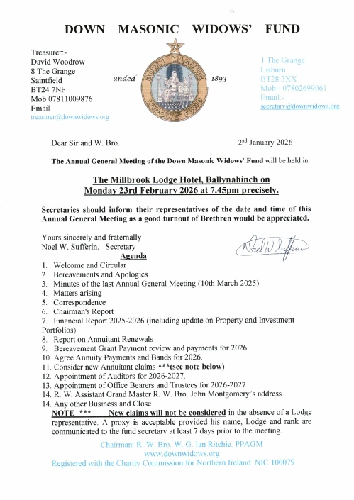 If you wish to support the work of our charity and make a personal donation please forward cheques, made payable to “Down Masonic Widows’ Fund” to the Secretary. Thank you.